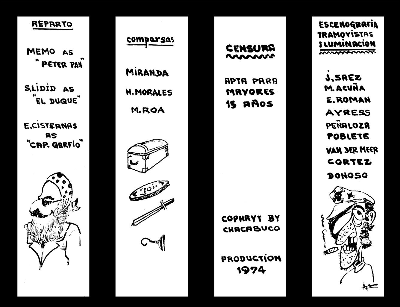 En Chacabuco –campo de prisioneros en el desierto chileno–, entre las diversas experiencias de acciones colectivas (obras de teatro, shows, grupos musicales) que tuvieron el humor como expresión fundamental, nos interesa mencionar la presencia del humor gráfico a través de una “película” hecha a la manera de la primitiva “linterna mágica”, que se hizo y se proyectó en Chacabuco: una “película de piratas” que precedía, a manera de créditos, un sketch en vivo que tenía a Peter Pan y al Capitán Garfio entre sus graciosos personajes.