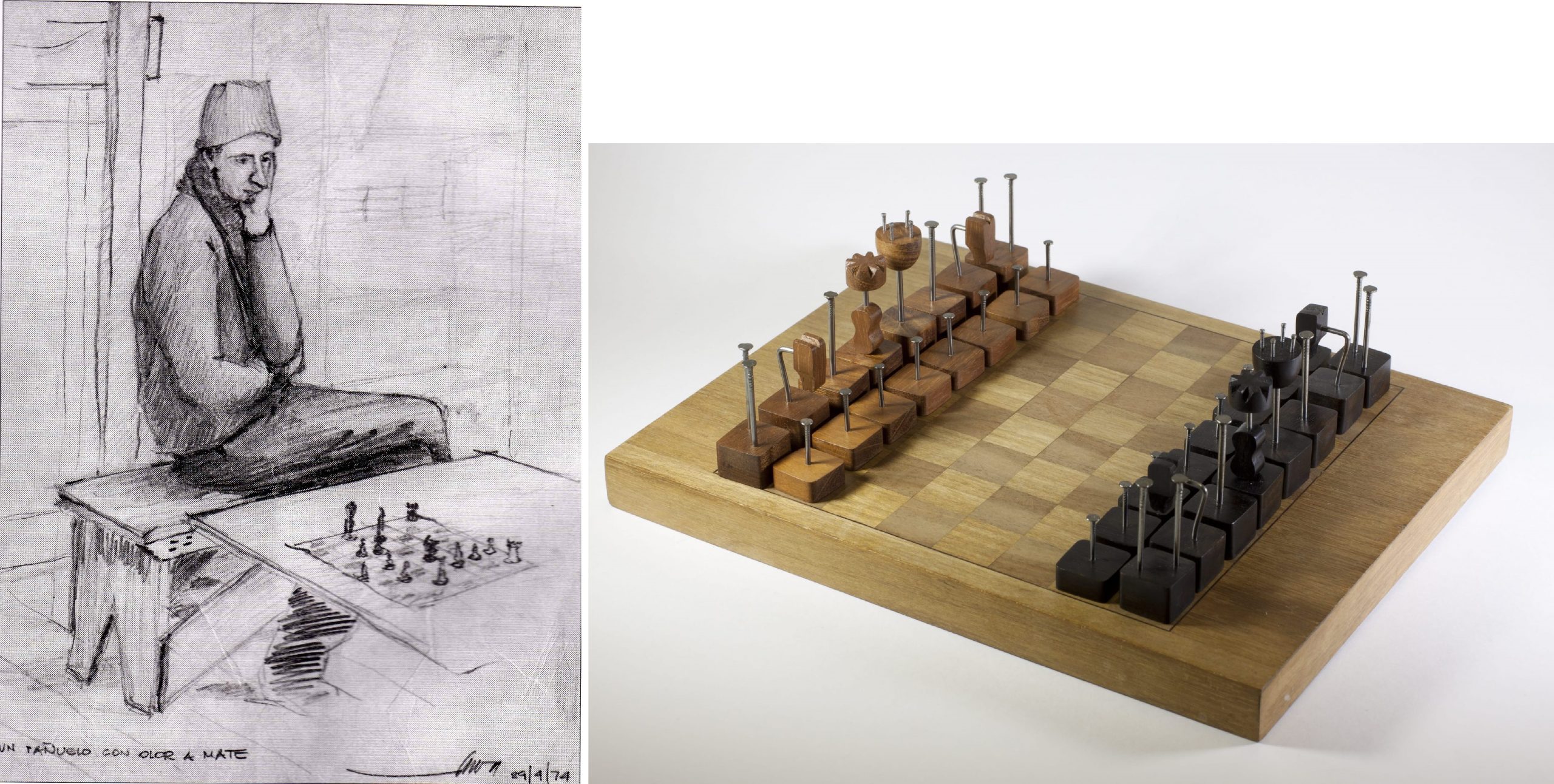 Imagen 2. Prisión política. Dibujo de Chile (Miguel Lawner, Isla Dawson, 1973) y ajedrez artesanal realizado por Elbio Ferrario en Establecimiento Militar de Reclusión N.° 1 – Penal de Libertad (ubicación actual: Museo de la Memoria, MUME, Montevideo, Uruguay).