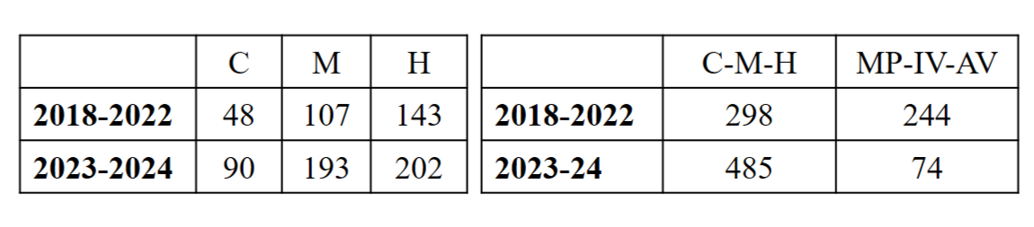 Fragmentando todo el segmento en dos períodos no proporcionados (2018-2022, con trece emisiones; y 2023-2024, con nueve emisiones) se aprecia, primero, un incremento de cada uno de los ítems bloque C-M-H; luego, un aumento desproporcionado de la asimetría entre el bloque C-M-H, y el conjunto constituido de maltratos a la piba (MP), insultos entre varones (IV) y apología a la violencia (AP). Lo cual señala por dónde pasa la tendencia del programa.