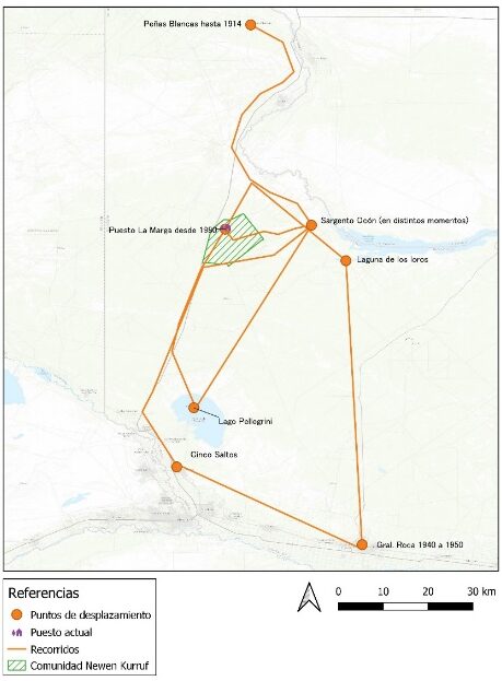 Para esta comunidad, como para el resto del pueblo mapuche, el alambrado significó también la limitación de la ganadería por trashumancia. Efectivamente, el alambrado “opone una ganadería móvil […] que se acopla al animal en largas peregrinaciones por entre aguadas y pastizales distantes […] a otra ganadería de superficies compartimentadas” (Richard y Hernández, 2018: 86). Ya referimos cómo el puesto emerge de esta fricción y genera un nuevo proyecto territorial. El litigio de la comunidad Newen Kurruf y su reclamo de reconocimiento de permanencia en el Puesto La Marga por cuatro décadas con patrones de ocupación tradicional también tienen que ver con este proceso.