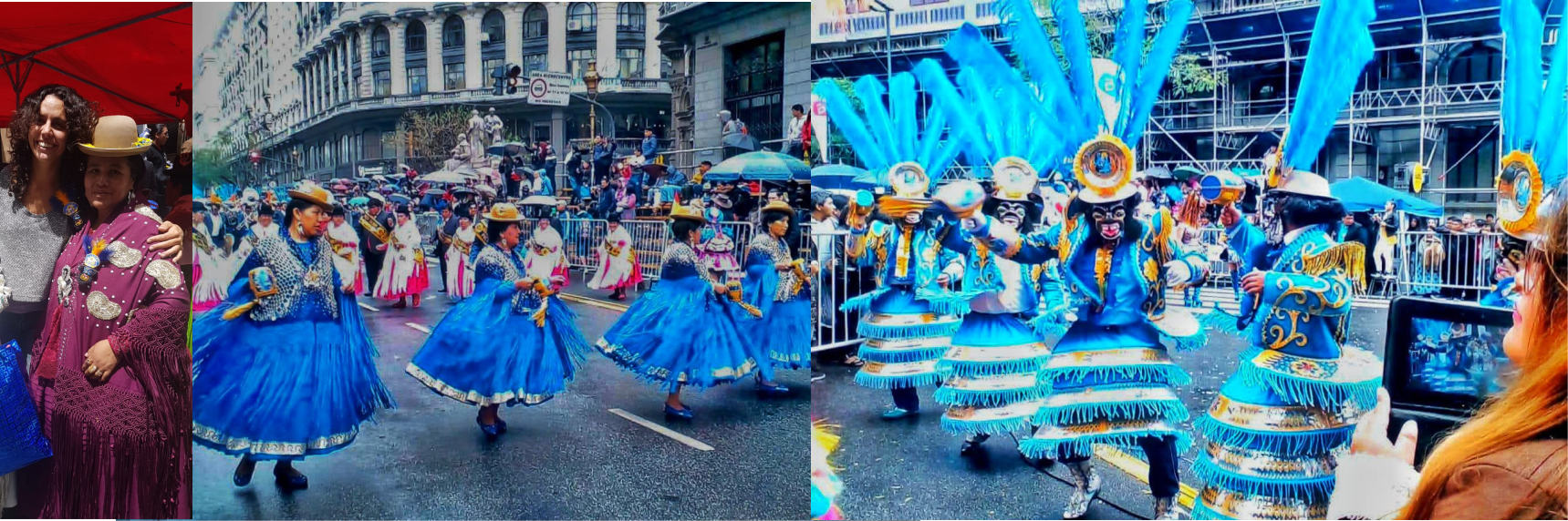 A Mercedes la conocí bailando. Era enero de 2017 y con un grupo de amigxs emprendimos camino hacia la recepción de Fraternidades Folklóricas de Gran Poder. La antigua iglesia que se emplaza en el centro de la zona comercial de La Paz, se vestía de color azul y amarillo dorado. Los Fanáticos del Gran Poder, iniciaban la mañana con celebración dentro y fuera de la iglesia. Observábamos los trajes, la entrada, la mixstura[6] que caía al piso y levantaba vuelo por la calle; y, mientras, escuchábamos como sonaba la banda al ritmo de la morenada. Bajando y girando desde la esquina, me fui dejando llevar por los colores y espacios libres que había entre la gente. Cierta naturalidad tenía para mí todo aquel ritual y la pomposidad de polleras y mantillas. Pero nunca había visto, entre sombrillas y cajones colorados, entre papelitos dorados y azules, banderitas de Argentina zarandeándose. Tres señoras de pollera que habían subido desde Buenos Aires a La Paz para participar de la recepción eran quienes las hacían flamear. El contacto visual fue rotundo. Algo les dijo a ellas que yo ‘era argentina’ y algo me dijo a mi -las banderitas en baile moreno-, que eran mujeres trajinantes, trasnacionales.