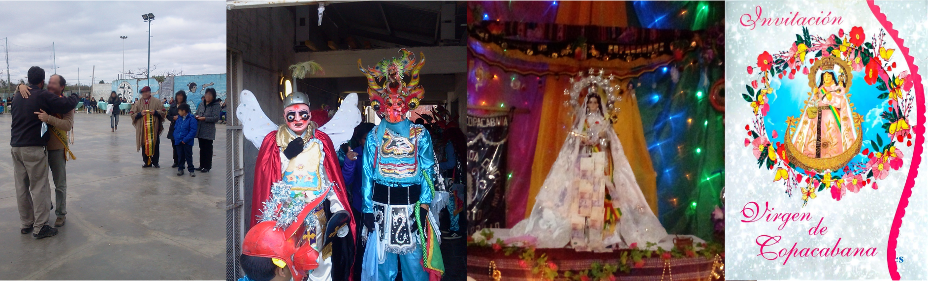 1- Pasantes Padre Pedro y Gastón, Fiesta Virgen de Copacabana, Barrio Carrillo, 2016; 2- Diablada, Fiesta Virgen de Copacabana, Barrio Carrillo, 2016; 3- Imagen que custodian Beti y Joaquín, Fiesta Virgen de Copacabana, 2017; 4- Invitación, Fiesta Virgen de Copacabana, 2017.