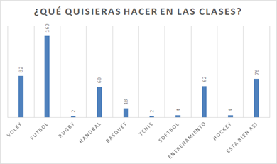 A partir de la quinta pregunta, las respuestas empezaron a ser más variadas debido a que pueden expresarse con lo que desean hacer en las clases de educación física. Un 16 % (76) explica que las clases como las realizan están bien, que no agregarían nada más; un 17 % (82) dice que quiere hacer más vóleibol; un 34 % (160) expresa su deseo por hacer fútbol; dos respuestas tuvieron un 0,5 % (2) cada una, las que piden rugbi y tenis, mientras que otras dos tuvieron un 1 % (4) cada una, y son las correspondientes a les estudiantes que quieren softbol y hockey; pidiendo clases de hándbol hubo un 13 % (60), y de básquetbol, solo un 4 % (18); por último, un 13 % (62) dice querer clases de entrenamiento de las capacidades físicas y corporales. De esta manera, nos encontramos con un alto porcentaje de practicantes que pide distintos tipos de deportes (71 %).