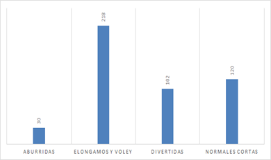 Cuando se les preguntó cómo son sus clases de educación física, comenzó a surgir una mayor variedad de respuestas, entre las cuales se encuentra que solo un 7 % (30) cree que son aburridas, un 46% (218) dice que hacen vóleibol y actividades funcionales, un 22 % (102) piensa que son divertidas y un 25 % (120) responde que son normales o son cortas.
