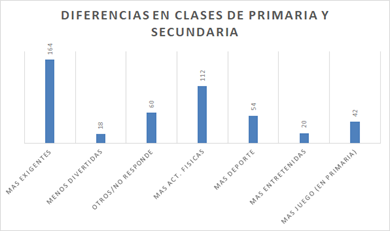 También sienten, en algunos casos, que favorece la relación con sus compañeres, a diferencia de otras materias. Creen también que estas clases son más exigentes con relación a las de primaria, por lo que se puede interpretar que, como respuesta a esa pregunta, hacían más juegos y en secundaria más deporte y actividad física.