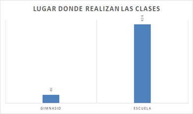 Con relación al lugar donde realizan las clases de educación física, se pudieron encontrar dos respuestas: la primera fue que en un gimnasio, con un 10 % (46), y la segunda fue que en la escuela, con un 90 % (424).