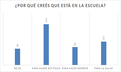 Se pudo hallar que un 16 % (78) de estes practicantes dice no saber para qué se encuentra la materia Educación Física en el colegio, pero el otro 84 % (392) restante se dividió en tres respuestas: 42 % (194) del total de practicantes piensa que está para realizar actividad física, un 18 % (86) piensa que se encuentra solo para realizar deportes, mientras que un 24 % (112) lo entiende más por el lado de las ciencias biológicas, dado que piensa que estas clases son para mejorar la salud.