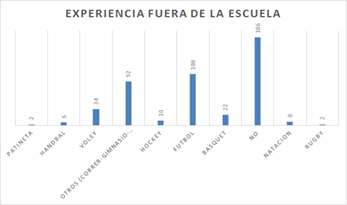 Se les realizó una pregunta final relacionada a si tenían experiencia en educación física fuera de la escuela. La respuesta llamativa fue del 39,5 % (186) que dijo que no realizan educación física por fuera de la escuela. El 60,5 % fue diverso en sus respuestas, y se separa en un 23 % (108) que realiza fútbol, un 7 % (34) que realiza voleibol, otro 4,5 % (22) que realiza básquetbol, un 2,5 % (10) que juega al hockey, un 2 % (8) que hace natación, un 1,5 % (6) que juega al hándbol, y un 1 % que se dividió a la mitad en andar en patineta (2) y hacer rugbi (2). El restante 19 % (92) realiza otras actividades físicas, como correr, trotar o hacer gimnasio.