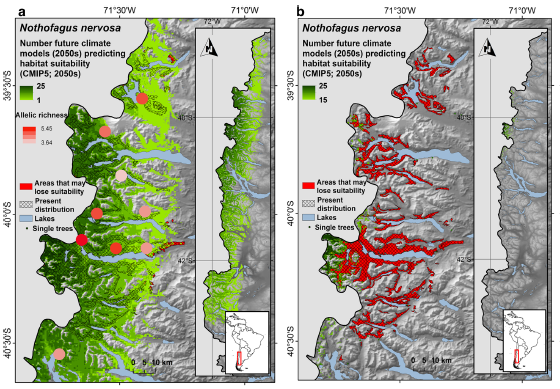 Figura 4. Escenarios de cambio climático y su impacto en Nothofagus nervosa. (a) Predicción del área de Nothofagus nervosa de acuerdo a 25 modelos predictorios y con las poblaciones de mayor diversidad genética; (b) área con mayor impacto por cambio climático (en rojo) en los próximos 50 años de acuerdo a los 10 modelos más probables. Las poblaciones de mayor diversidad genética de la especie se perderían (De Marchelli et al. 2017).
