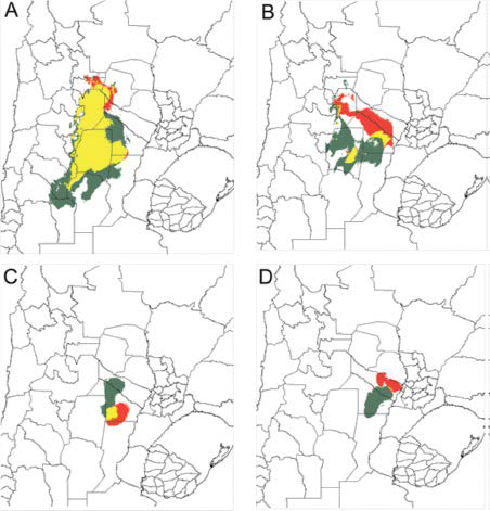 Figura 5. Cambio climático en Prosopis alba y P. hassleri. Áreas estables o de bajo impacto (amarillo), áreas de alto impacto o de retracción del rango (rojo) y áreas de expansión (verde) de cada una de las especies/morfotipos analizados, basado en el modelado de sus respectivas distribuciones potenciales en el presente y en un escenario de cambio climático futuro. A) Prosopis alba “santiagueño”, B) P. alba “chaqueño norte”, C) P. alba “chaqueño sur”, D) P. hassleri (AUC > 0,8 en todos los casos) (Venier et al. 2013).