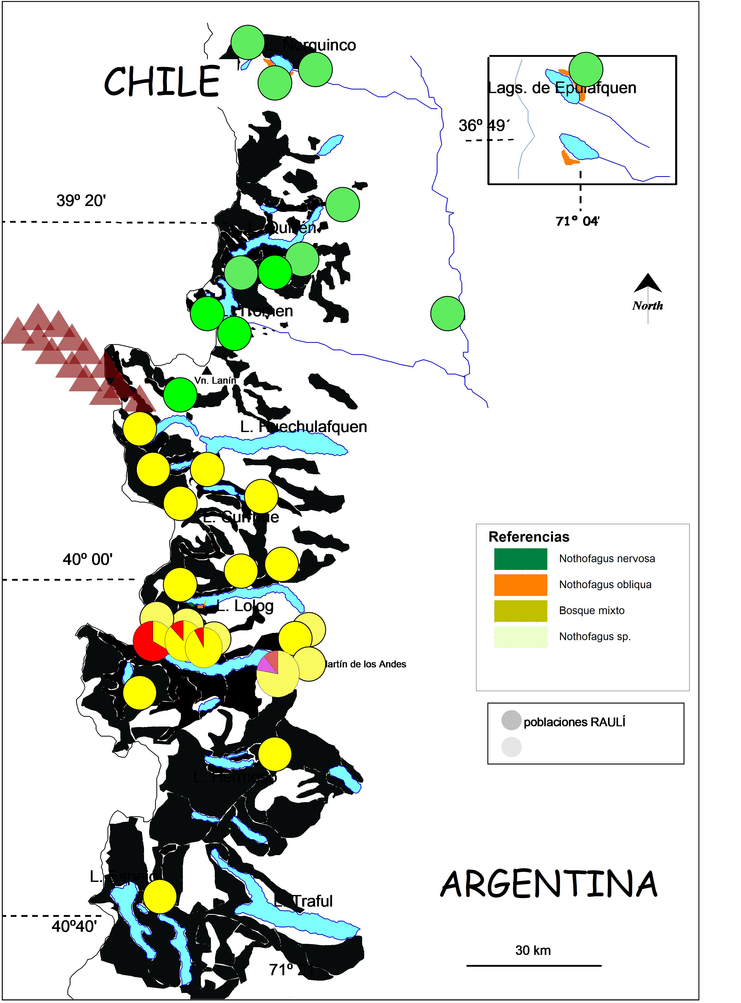 Figura 1. Diversidad genética en haplotipos de ADN de cloroplasto en Nothofagus nervosa y N. obliqua. Se destaca el quiebre en la distribución de los haplotipos en la latitud del lago Huechulafquen. En el oeste de la cuenca del lago Lácar se destaca una zona de alta diversidad genética en N. nervosa. (Se muestra el área de distribución natural de todo el bosque sin diferenciar entre especies ni tipos forestales).