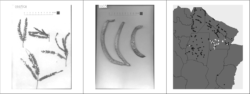 Figura 3. Imágenes de hojas y frutos y posición de los individuos para los tres grupos morfológicos diferenciados de Prosopis alba (Verga et al. 2009). De arriba hacia abajo: Prosopis alba “Santiagueño”; P. alba “Chaqueño norte”; P. alba “Chaqueño sur”.