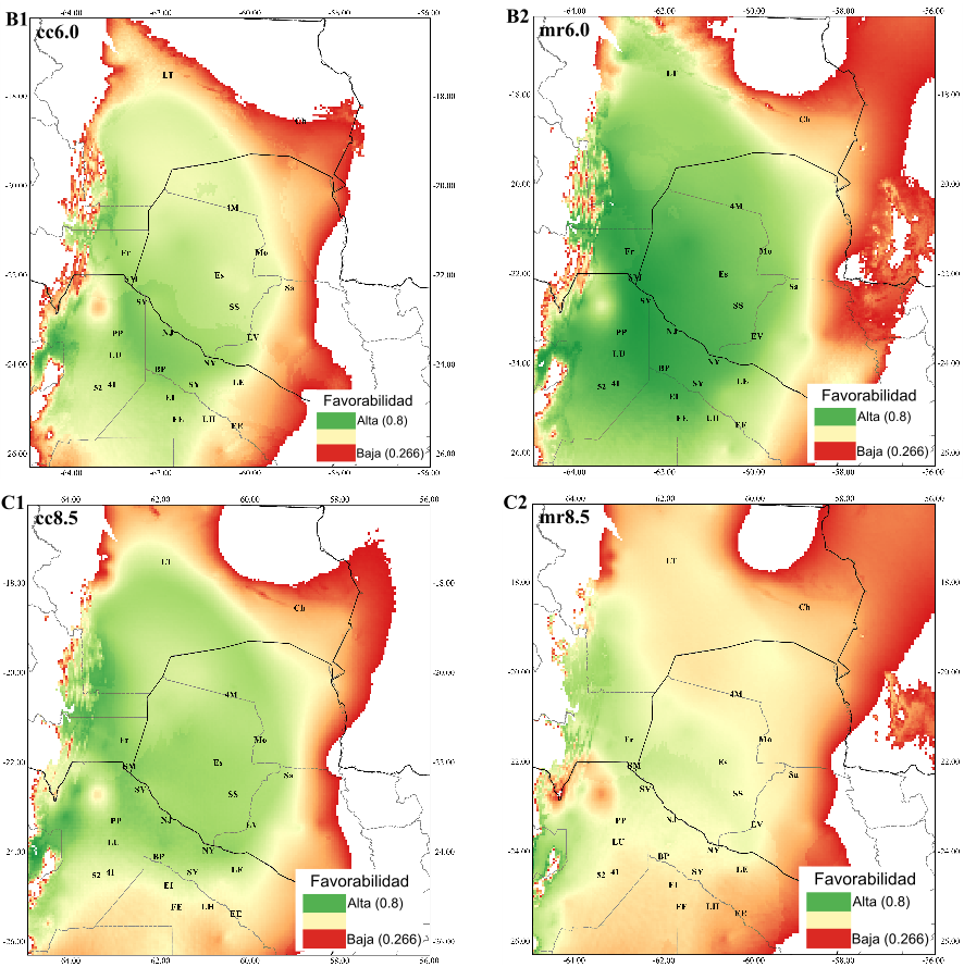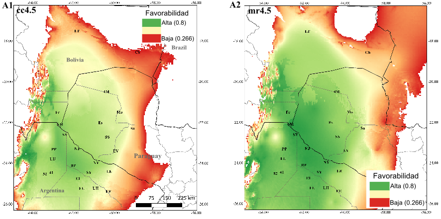 Disminuiría el área probable de distribución de este a oeste principalmente, observándose favorabilidad climática a futuro en la transición Chaco-Yungas y en las Yungas (Figura 6), que no son favorables actualmente para la especie por la altitud y las condiciones edáficas. Además, de darse estas condiciones, podría perderse diversidad genética, que es alta en áreas de retroceso (norte y sureste de la distribución) (Camps 2019).