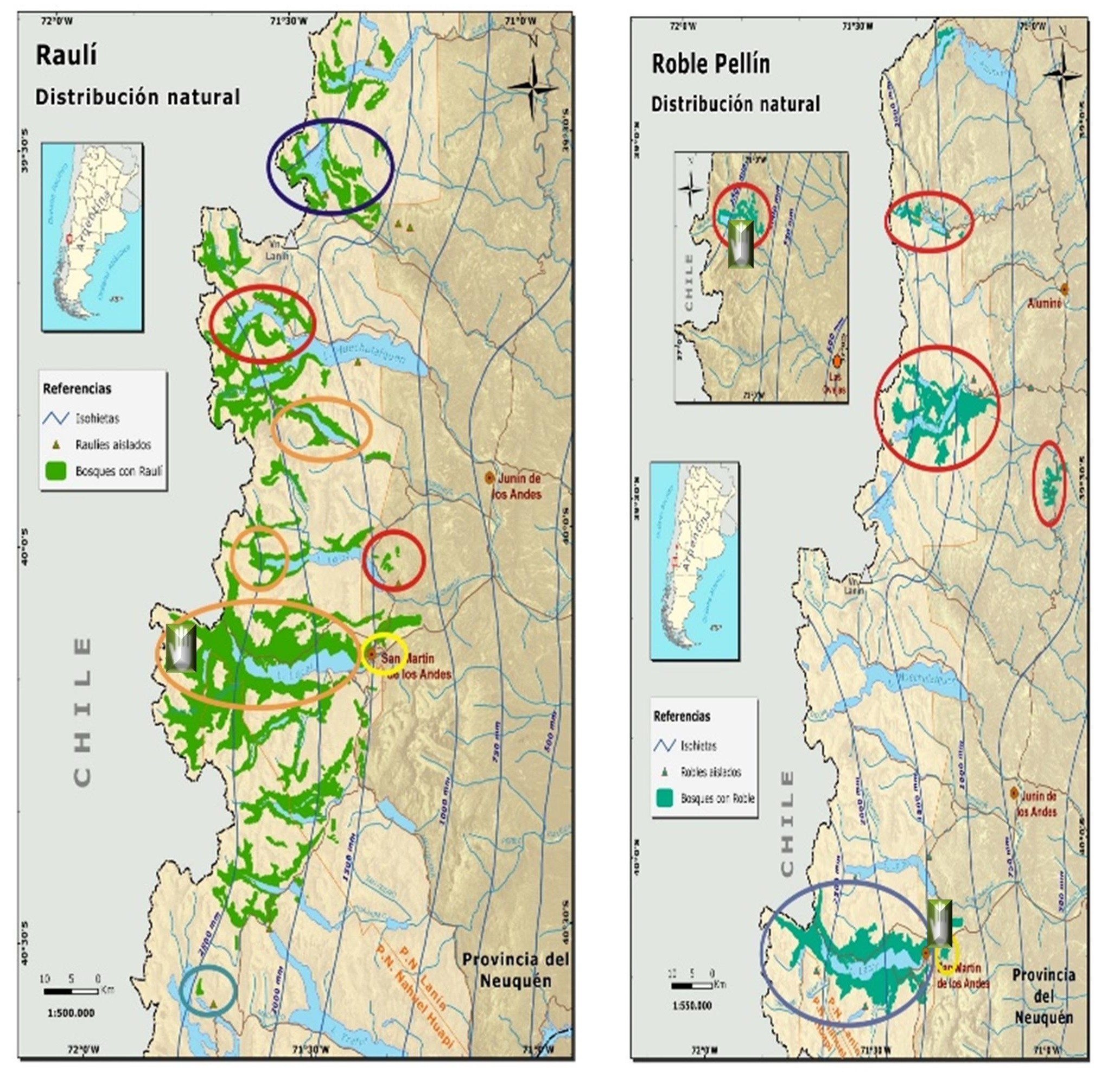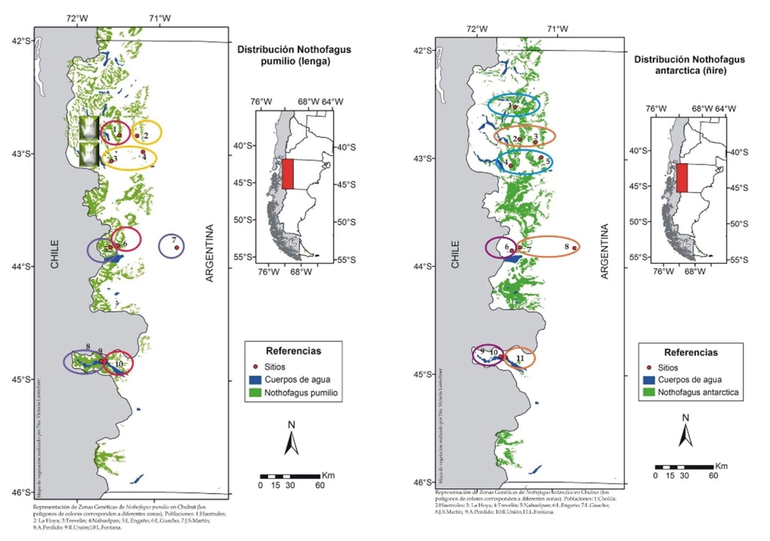 La disposición 357/03 del 8 de agosto de 2003 del Parque Nacional Lanín modifica el estatus de protección de la zona oeste de las cuencas Lácar y Lolog en función de la alta diversidad genética encontrada en ella, impidiéndose la tala de árboles (De Marchelli y Gallo 2006, Azpilicueta, Marchelli y Gallo 2009, Gallo et al. 2009). Claramente se diferencia una zona genética al norte y otra al sur del volcán Lanín. Se destaca también una alta diversidad en la zona oeste de la cuenca Lácar para la especie N. nervosa detectada no solo con la variación en el ADN de cloroplasto sino también en ADN nuclear y en características fenotípicas adaptativas. Hasta la fecha es el único caso conocido de este tipo en el mundo (Figura 1).