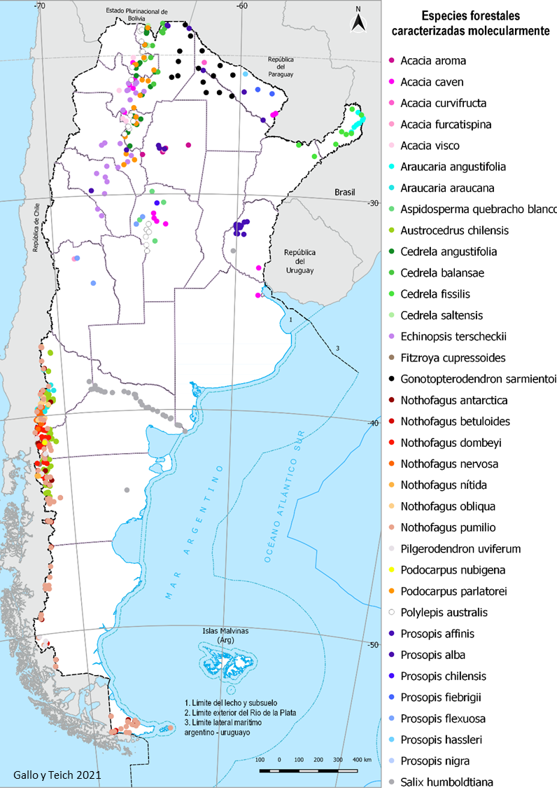 A partir de finales de 1980, se comienza con los primeros estudios de diversidad genética isoenzimática y molecular en especies forestales nativas en el país (por ejemplo, Burghardt y Palacios, 1981; Saidman, 1986; Saidman y Vilardi, 1987; Saidman, 1990; Gallo y Geburek, 1994). En 1993, se crea en el INTA de Bariloche el primer laboratorio de genética molecular específico para estudios de genética poblacional de especies forestales. Con la formación de recursos humanos, se fue incrementando el número de grupos de investigación en el país dedicados a genética poblacional y genética ecológica de especies forestales nativas, tanto en el INTA como en universidades nacionales e institutos del CONICET. La cantidad de estudios de diversidad y diferenciación genéticas aumentó sensiblemente. En la actualidad, la Argentina cuenta con una gran cantidad de información sobre la diversidad genética molecular intraespecífica de especies forestales nativas, es decir, con la información más directamente relacionada con lo que denominamos recurso genético forestal. El listado de las especies forestales nativas analizadas molecularmente y la ubicación geográfica de las poblaciones muestreadas se esquematiza en la Figura 1.