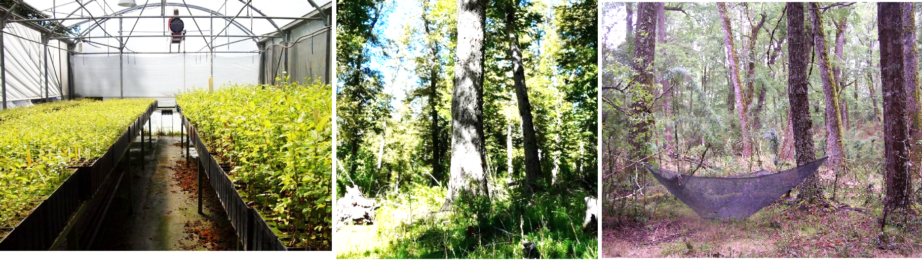 Figura 9. Programa de mejoramiento en Nothofagus obliqua. Ensayo de procedencias de cuatro meses de edad en vivero, individuo adulto de 170 años de edad en bosque nativo y área productora de semilla registrada en el INASE (fotos: L. Gallo).