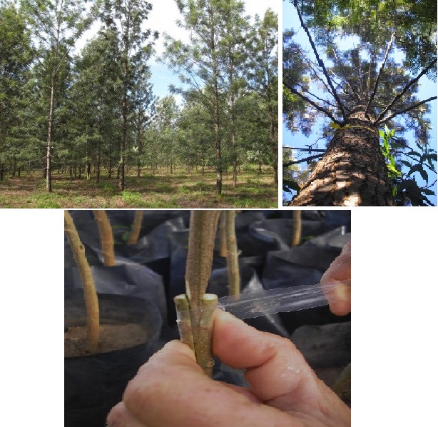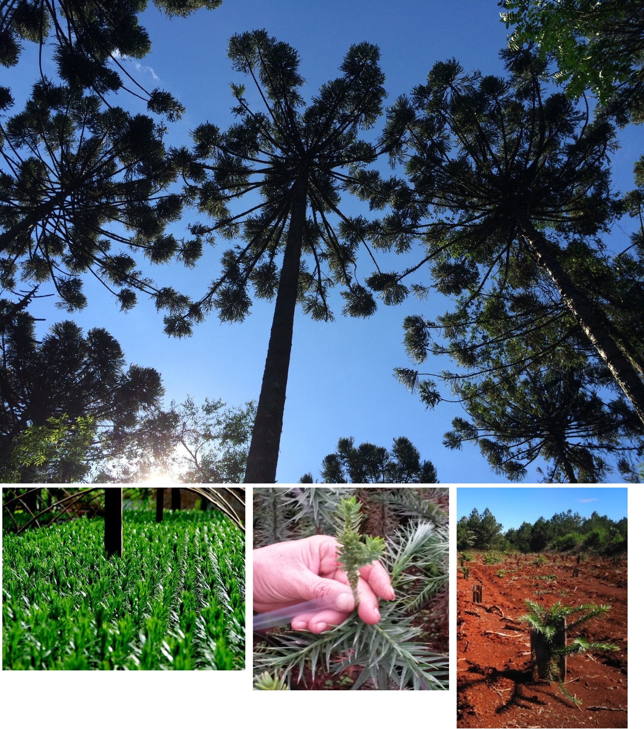 Figura 3. Diferentes etapas del programa de mejoramiento genético en Araucaria angustifolia (fotos: M. E. Gauchat). Arriba: Plantación de Araucaria angustifolia de más de 60 años de edad en Campo San Antonio, Misiones, Argentina. Abajo, de izquierda a derecha: Progenies en vivero; Injerto de púa; Prueba de progenies de polinización abierta.