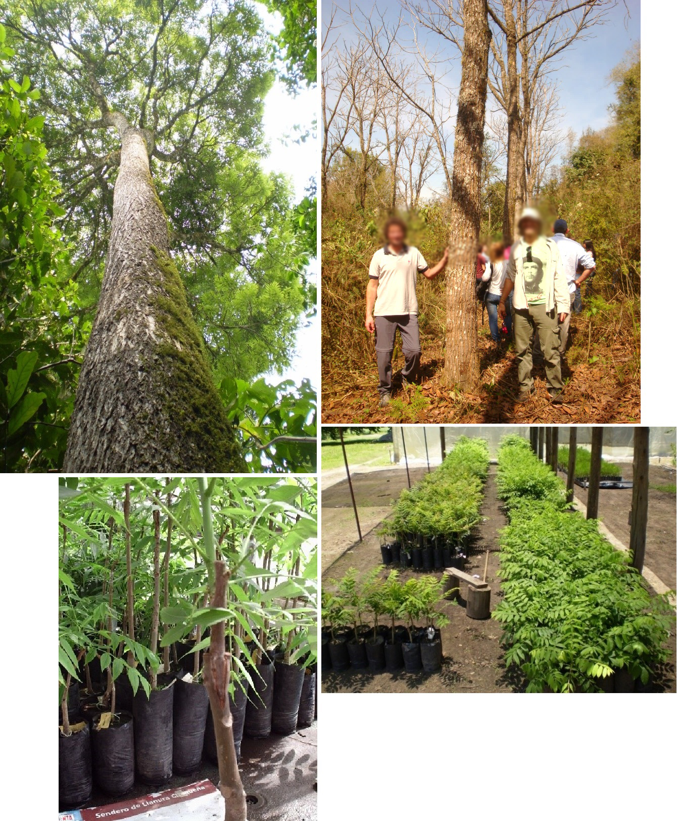 Figura 4. Programa de mejoramiento en el género Cedrela. Árbol adulto de Cedrela angustifolia. Cedrela fissilis de 12 años de edad y 43 cm de DAP en fajas de enriquecimiento en selva de altura degradada. Injertos de Cedrela fissilis para instalación de Huerto Semillero Clonal (fotos: L. Fornés).