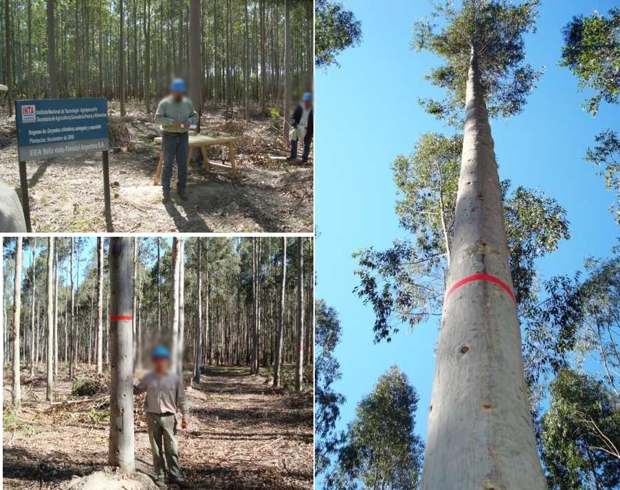 Este género originario naturalmente de Australia se introdujo en la década de 1970 en el norte de la Argentina con fines ornamentales, en forma de cortinas y en algunas pocas plantaciones comerciales. Las principales especies cultivadas son Corymbia torelliana, Corymbia citriodora subsp. citriodora, Corymbia citriodora subsp. variegata, Corymbia henryi y Corymbia maculata. El INTA incorporó estas especies a sus programas de mejoramiento en el año 2000 e instaló una red de ensayos con materiales del Brasil, Sudáfrica, Australia y locales. Se seleccionaron 30 ejemplares sobresalientes de Corymbia citriodora subsp. variegata en volumen y rectitud de fuste, utilizando la metodología clásica de selección masal (árboles comparación), y se espera una ganancia genética en el huerto semillero clonal de aproximadamente 17 % en volumen. Actualmente, el programa cuenta con un área productora de semilla de 1,5 ha (INASE 2020), huertos semilleros de plántulas y clonales en evaluación e híbridos de Corymbia torelliana x Corymbia citriodora subsp. variegata (López et al. 2016) (Figura 6).