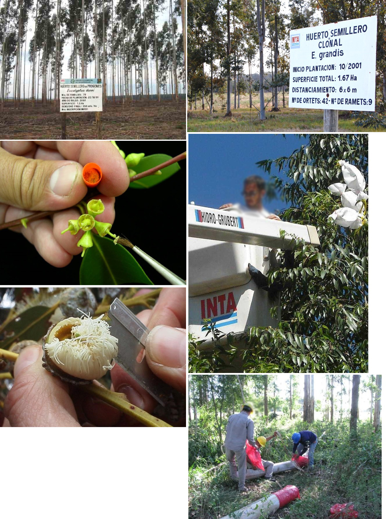 Figura 7. Programa de mejoramiento en el género Eucalyptus. De arriba abajo y de izquierda a derecha: huerto semillero de progenie de Eucalyptus dunnii. Huerto semillero clonal de Eucalyptus grandis. Polinización artificial en flores de Eucalyptus grandis (fotos: L. Harrand). Emasculación en flores de Eucalyptus globulus (foto: P. Pathauer). Muestreo para determinación de calidad de madera a los 20 años en Eucalyptus dunnii (foto: L. Harrand).