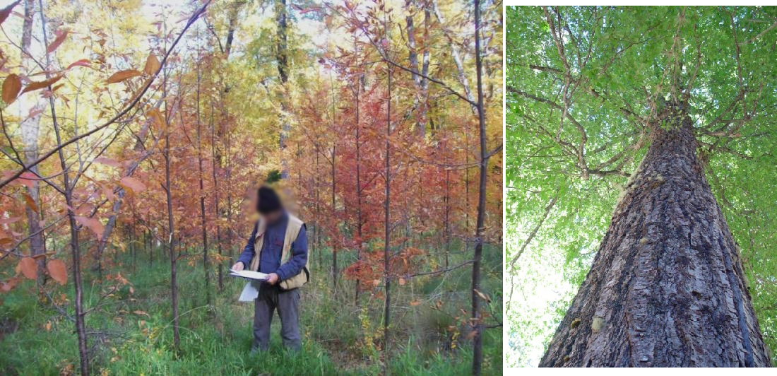 Figura 10. Programa de mejoramiento en Nothofagus nervosa. Prueba de progenie y ensayo de procedencias de 12 años de edad en Yuco Alto e individuo adulto de 165 años de edad en bosque nativo (fotos: M. Lanari y L. Gallo).