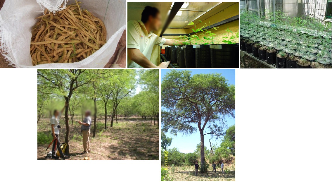 Figura 11. Programa de mejoramiento en Prosopis alba. De arriba a abajo y de izquierda a derecha: vainas de Prosopis alba, ensayo de respuesta ecofisiológica, plantines en vivero, ensayo de procedencia y árbol adulto selecto en bosque nativo con destacada rectitud y despeje de fuste en Campo Durán, Comunidad Chané (fotos: D. López Lauenstein y A. Verga).