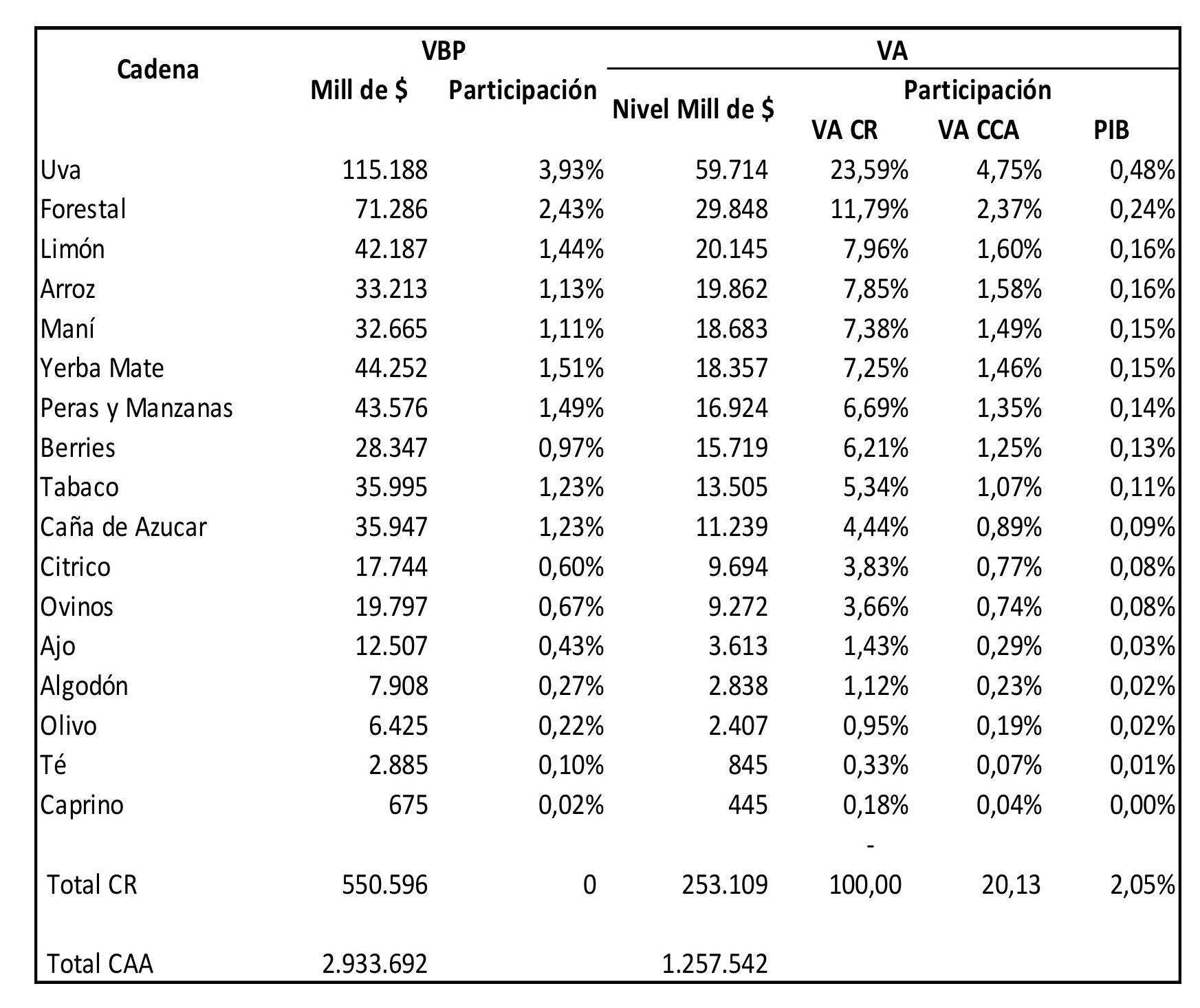 Nota: CR: cadenas regionales; CAA: cadenas agroindustriales; VA: valor agregado; VBP: valor bruto de producción.