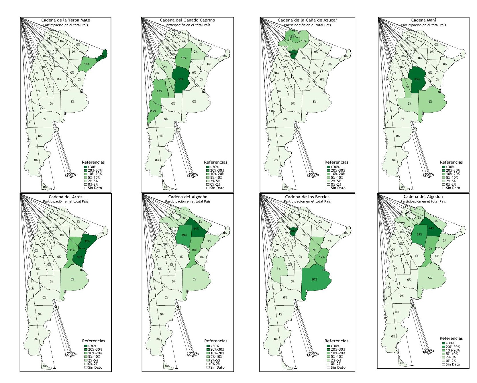 Llevados estos criterios de estructura y funcionamiento al caso argentino, las economías regionales comprenden las siguientes cadenas productivas: ajo, algodón, arroz, frutas finas, caña de azúcar, caprinos, ovinos, cítrico, forestal, limón, maní, peras y manzanas, tabaco, té, uva y yerba mate. Atento a las particularidades productivas, se adopta el concepto de “cadenas productivas”, que cubre no solo lo ocurrido a nivel primario, sino que además incluye el aprovisionamiento de insumos y las primeras etapas industriales (Anlló, Bisang y Salvatierra, 2010; Lódola, Bisang y Morras, 2018; Lódola y Picón, 2021; Carciofi et al., 2021).