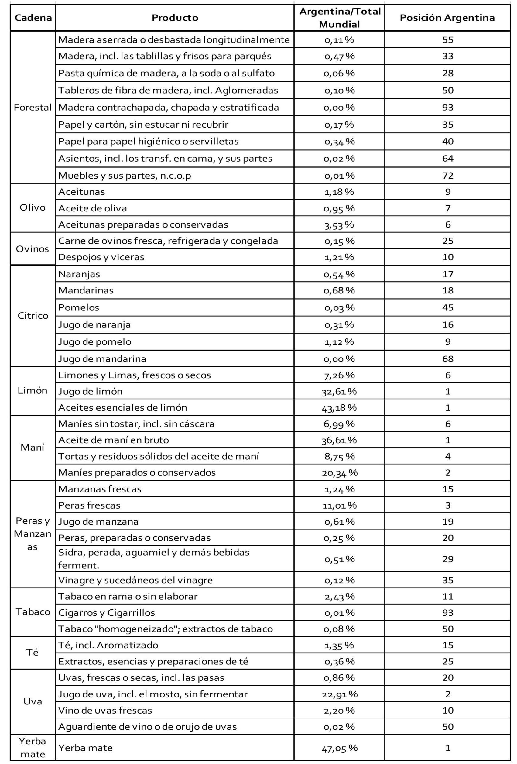 Son destacables, en particular, las participaciones de las ofertas argentinas en materia de jugo y esencia de limón, yerba mate, derivados del maní y peras. Adicionalmente, el lugar que ocupan los productos regionales exportados en el ranking de las exportaciones mundiales indica ciertos liderazgos en unos pocos casos: peras frescas, yerba mate, jugo de uva, aceite de maní/otros derivados y jugos/derivados del limón.