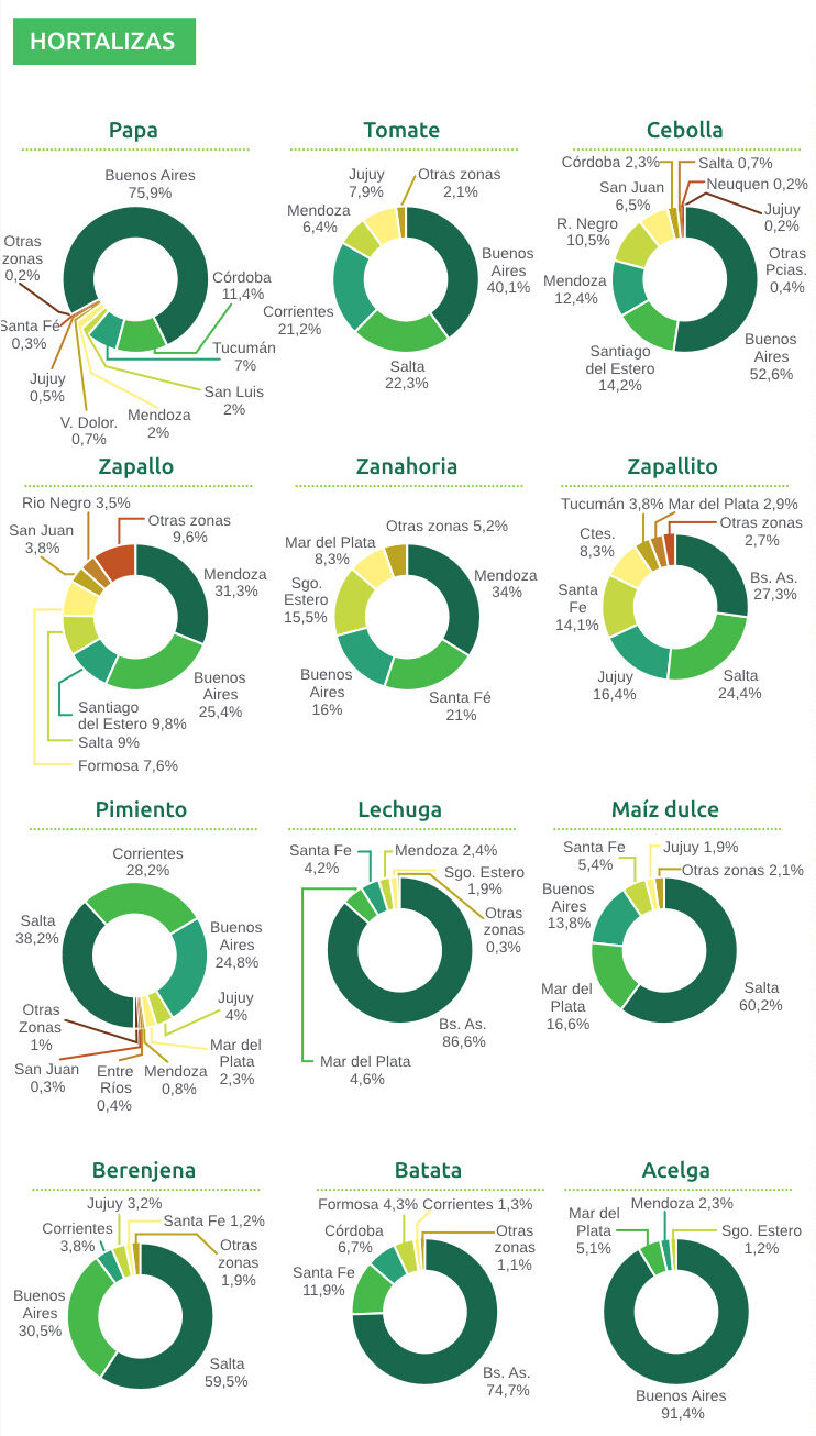 En otros, como el caso de la lechuga y otras verduras de hoja, además de las localizaciones específicas, las ofertas regionales se complementan con la oferta de las producciones periurbanas, ubicadas especialmente en Buenos Aires (aledaños de La Plata y Mar del Plata) y Rosario. Siendo productos que se degradan rápidamente, conforman mercados con grados adicionales de variabilidad.