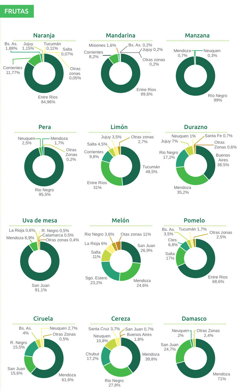 Según datos censales, en Argentina se cultivan anualmente 362 mil hectáreas de legumbres, 490 mil de frutales y 568 mil de cultivos industriales[4] destinados al uso alimenticio (Indec, 2021). El mercado interno absorbe la casi totalidad de las producciones de hortalizas, alrededor del 80 % de los cultivos industriales destinados a la alimentación y, en promedio, el 30 % de las frutas (dominadas por peras y manzanas). Algunas estimaciones indican que, de los complejos frutihortícolas en su totalidad, casi un 70 % se destina al mercado interno (Campos y Eleicegui, 2013).
