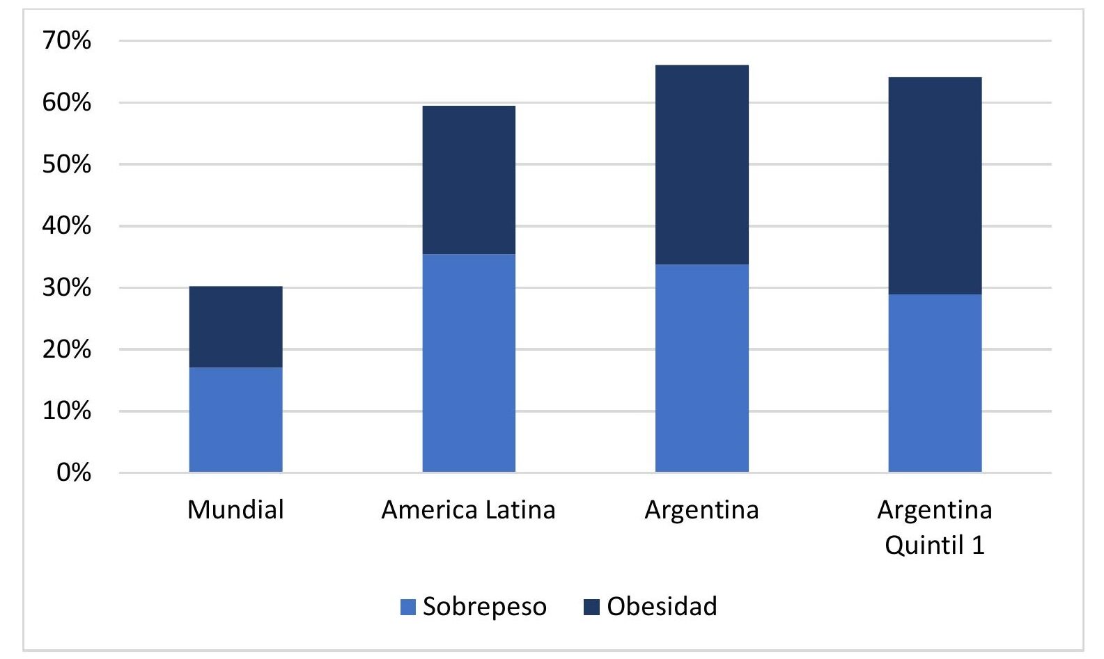 Estos valores son más alarmantes y críticos si se considera el análisis antropométrico en el que el exceso de peso asciende a 66,1 % de la población, lo que es coincidente con lo relevado por la Segunda Encuesta Nacional de Nutrición y Salud, estudio en el que dicho guarismo se ubica en 68,1 %. Por otra parte, el sobrepeso y la obesidad representan el 33,7 % y 32,4 %, respectivamente. En el caso de la obesidad, estos valores son más altos en los estratos económicos más bajos, alcanzando 35,2 %, proporción que muestra un diferencial de cerca de 40 % respecto al quintil más alto, que se ubica en el 25,5 %.