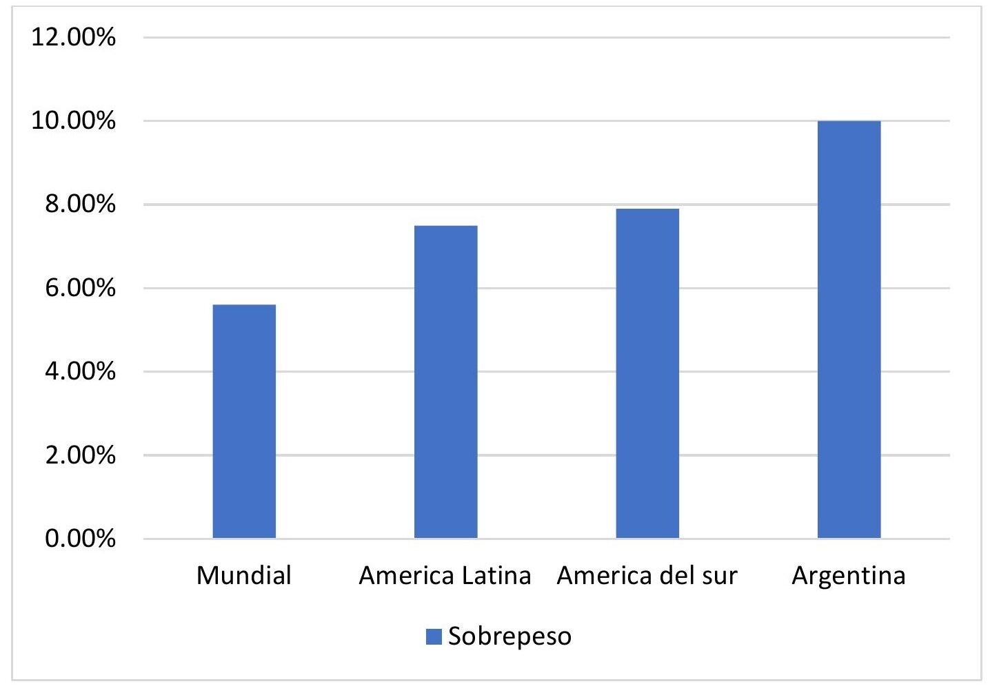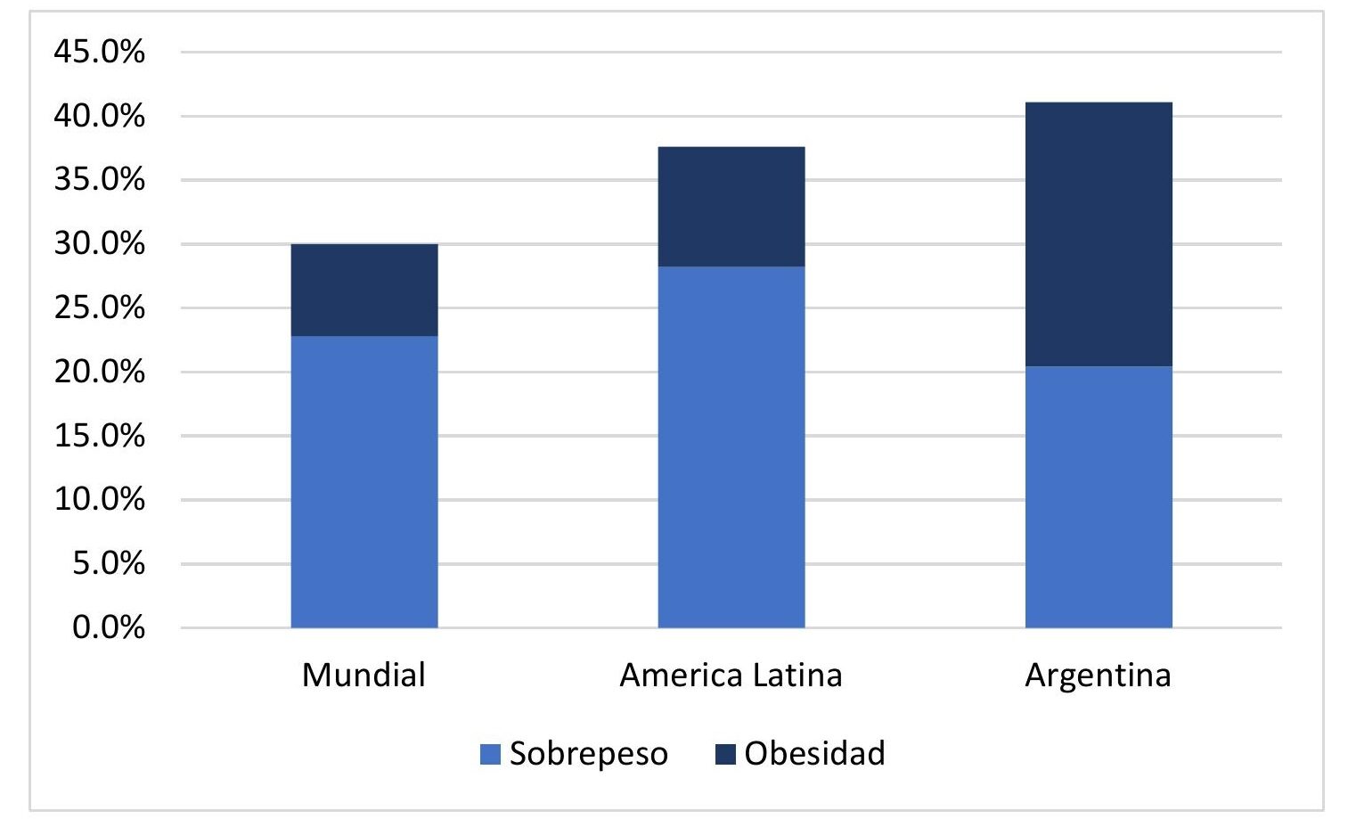No obstante, es importante prestar mayor atención al exceso de peso en niños y niñas menores de 5 años y en adolescentes en Argentina. En estos grupos etarios, el exceso de peso es mayor en el país que en la media regional y la media mundial. La prevalencia de exceso de peso en Argentina alcanza el 13,6 %, superior a la media regional, siendo superior en sobrepeso (10 %) y obesidad (3,6 %), respectivamente. En el caso particular de los adolescentes, al interior de ese primer grupo, la tendencia se acentúa. En efecto, la cifra de exceso de peso alcanza al 41,1 % de la población, del cual el sobrepeso y la obesidad alcanzan el 20,7 % y el 20,4 %, respectivamente.
