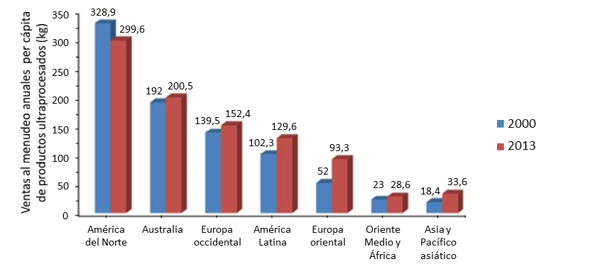 Gráfico 2. Ventas al menudeo per cápita de productos alimentarios y bebidas ultraprocesados en regiones del mundo, 2000 y 2013