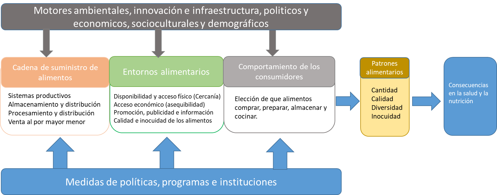 La cadena de alimentos está asociada con la conformación y composición de la oferta de alimentos donde interactúan todos los eslabones de la cadena en pos de asegurar y garantizar la oferta. Por su parte, el entorno alimentario es el contexto económico, social y cultural que enmarca la interacción de los consumidores con el sistema alimentario y que influye en las decisiones del consumidor al igual que en la aceptabilidad de los alimentos y las dietas, es decir, acceso físico y económico (proximidad y asequibilidad), promoción, información sobre los alimentos, inocuidad y calidad. Por último, aunque no menos importante, el comportamiento del consumidor está influenciado por el entorno. Este comportamiento puede variar con el tiempo y abrir vías para sistemas alimentarios más sostenibles que mejoren la seguridad alimentaria, la nutrición y la salud.