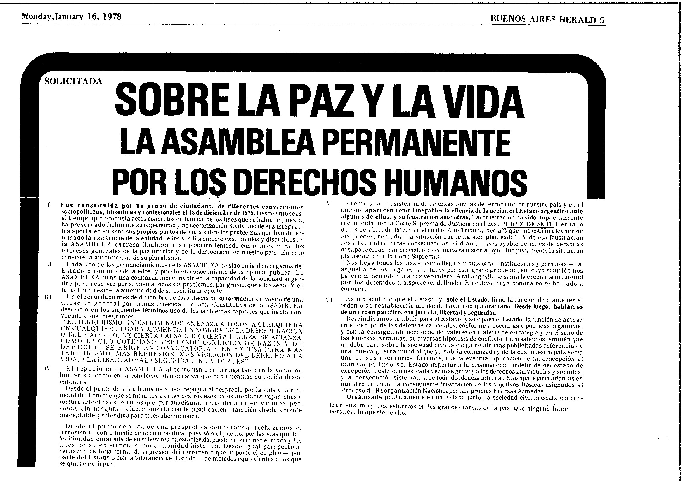 En enero de 1978, por ejemplo, el Buenos Aires Herald publicó “Sobre la Paz y la vida, la Asamblea Permanente por los Derechos Humanos”, que era la difusión de un petitorio que había sido entregado a la presidencia.