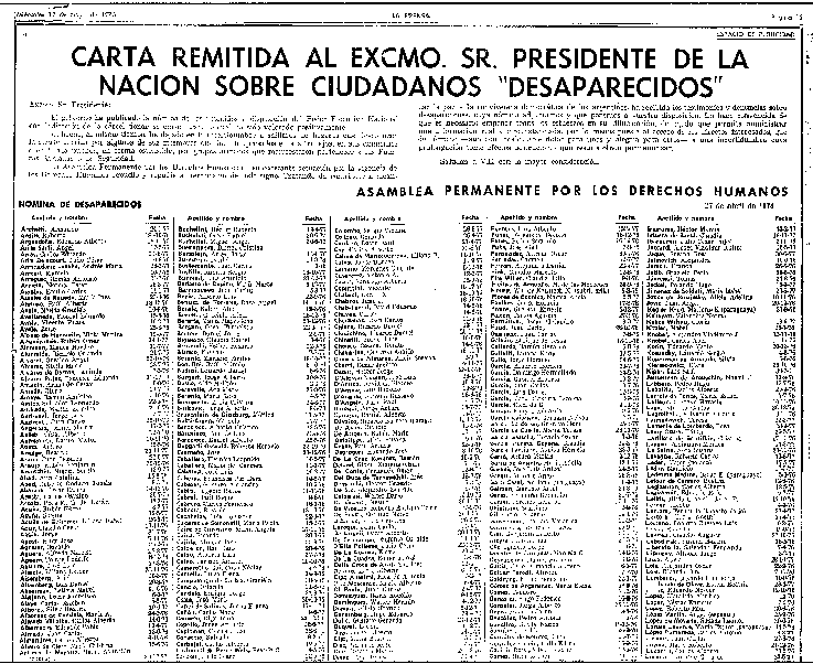 Pero la situación más grave y dramática que, desde este punto de vista enfrenta el país, es la de los denominados ‘desaparecidos’ […] Para tener una idea clara de la situación que atraviesa la Argentina es importante procurar determinar el número de los ‘desaparecidos’. Las tres organizaciones dedicadas al tema en el país (Asamblea permanente por los Derechos Humanos; Movimiento Ecuménico por los Derechos Humanos y Liga argentina por los Derechos del Hombre) poseen testimonios escritos de parientes de poco más de 3.000 personas detenidas, prima facie, por la autoridad pública e inmediatamente desaparecidas. En muchos casos existen abundantes pruebas de la intervención de las fuerzas armadas u organismos de seguridad.[26]