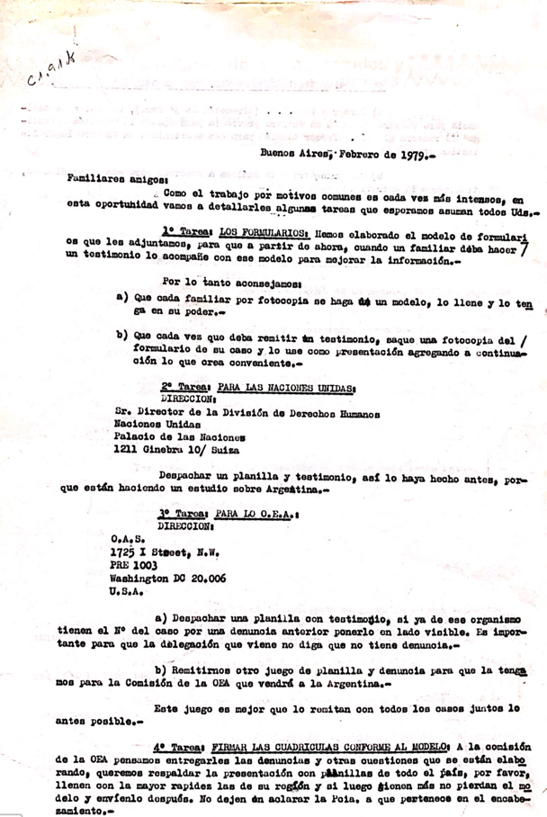 En febrero de 1979, FADERAP reiteró una comunicación general a las organizaciones de familiares de las provincias adjuntando un modelo de formulario que proponía acompañar a cada testimonio. Ambas piezas debían ser enviadas en primer lugar a “la División de Derechos Humanos de Naciones Unidas” para sumar información a un estudio que estaba realizando dicho organismo internacional. Indicaban también otras tareas destinadas a presentarlos en la visita de la OEA, y también al propio archivo de la organización.[22]