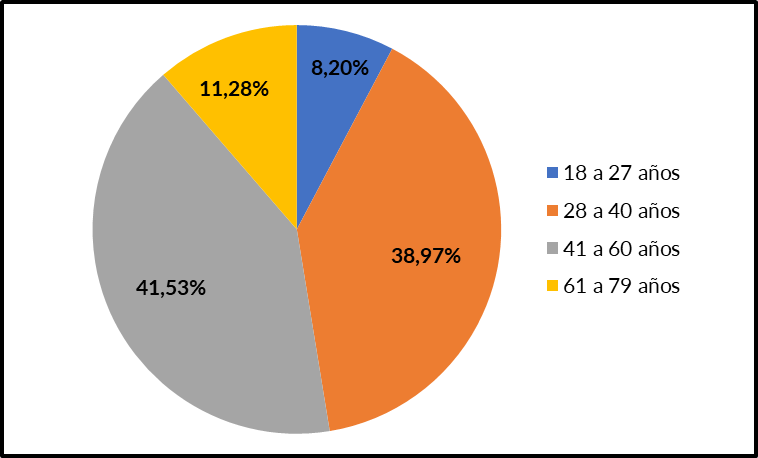 En la encuesta resultaron igualmente predominantes los/as practicantes pertenecientes a las franjas de 28 a 40 años (el 38,9% de los casos) y de 41 a 60 años (el 41,5% de los casos). El 11,3% de los/as encuestados/as tiene entre 61 y 79 años y el 8,2% se ubica entre los 18 y los 27 años. No se registraron casos de menores de 18 ni de mayores de 79 años.