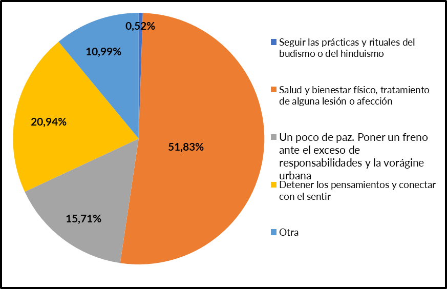 Por otro lado, con relación a los motivos por los cuales las personas se acercan al yoga, regularmente los/as entrevistados/as aludieron a la relevancia que tiene el acercamiento terapéutico a la práctica, como tratamiento para alguna lesión o dolor específico o como complemento en un tratamiento determinado (posquirúrgico, oncológico, psiquiátrico), que luego —en muchos casos— puede estimular el despliegue de un camino que trasciende esta motivación inicial y favorece la adopción de nuevos hábitos, actitudes y formas de vida. Esta idea pudo constatarse en la encuesta realizada, en la que más de la mitad de los/as practicantes (el 51,8%) declaró que la razón principal por la que hace o hizo yoga como actividad regular es “la salud y el bienestar físico, el tratamiento de alguna lesión o afección”.