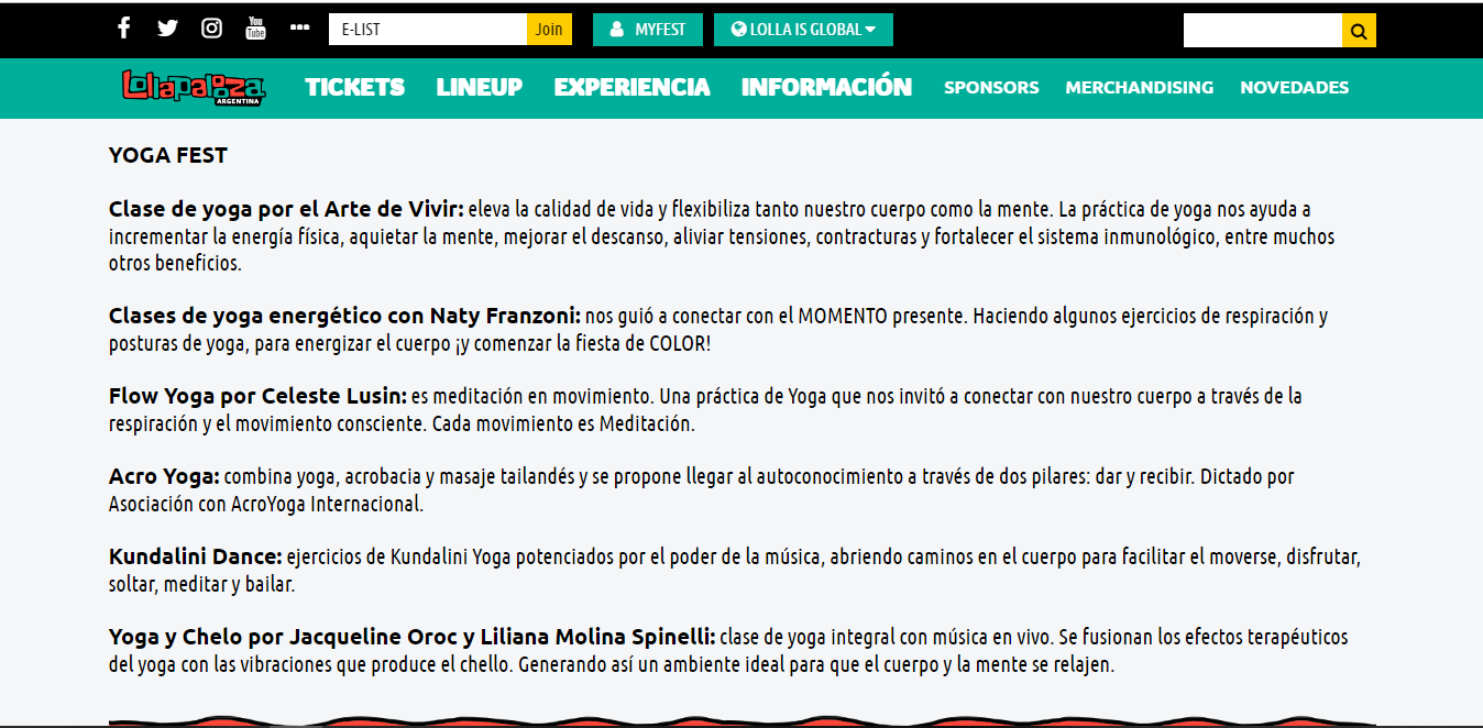 La edición 2019 del festival Lolapalooza, además de congregar bandas nacionales e internacionales, fue el marco en el que tuvo lugar el Yogafest, mediante el cual se concretó la intención de acercar al público “mensajes que comprenden más que la música, y buscan estimular un estilo de vida más saludable, responsable y consciente”.