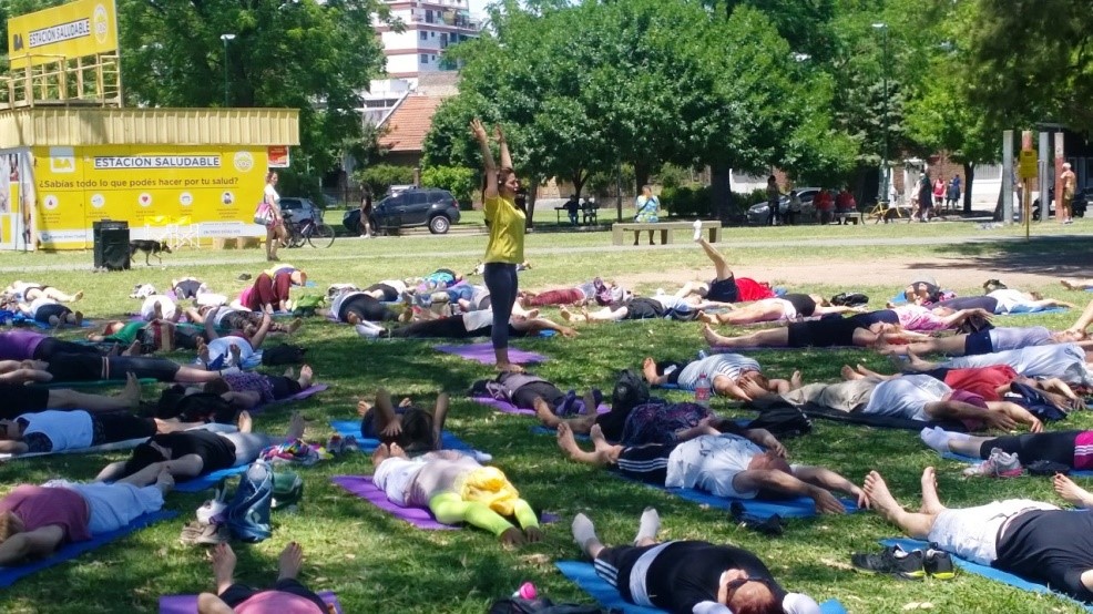 El yoga como política pública se puso en marcha en CABA en el marco del Programa Plazas Activas de la Subsecretaría de Deportes,[45] destinado a toda la población de la ciudad con el fin de promover la vida saludable a través de la práctica del deporte. Foto: C. Duer (año 2015).