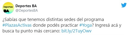 Se trata de una iniciativa pública que acerca a plazas y parques de CABA clases de gimnasia, baile y otras actividades físicas, entre las que se destaca el yoga. Esta apertura a lo no Occidental desde el campo de la actividad estatal tuvo como condición de posibilidad y de legitimidad la difusión del yoga como práctica no religiosa para el bienestar.