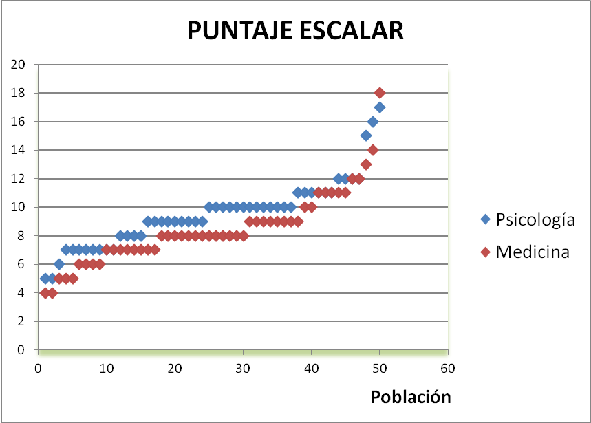 Los resultados obtenidos a partir de la aplicación del instrumento se muestran en la Figura 1. Éstos permiten observar que los alumnos se encuentran, en un amplio porcentaje, por debajo de la media esperada (puntaje escalar 10). Es decir que, a pesar de las estrategias pedagógicas de avanzada que pone en práctica la institución académica, éstas no han sido suficientes para alcanzar el nivel de pensamiento esperable para la edad. Además de estos resultados se desprende que el estudio realizado no fue suficiente para: (a) detectar diferencias significativas entre ambos grupos de alumnos (Psicología-Medicina); y (b) determinar las causas por las cuales los alumnos no alcanzan un nivel de pensamiento esperado para su edad. En este sentido, se cree que probablemente el déficit en la educación se encuentre en los años anteriores de escolaridad.