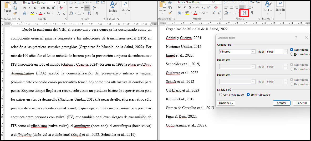 Lo primero es copiar todo el documento (“ctrl e” y luego “ctrl c” en los procesadores de texto de escritorio) y pegarlo en un nuevo documento en blanco. A continuación, se debe borrar todo el texto dejando sólo las citas y colocar un “enter” al final de cada una. En el caso de las citas parentéticas, se debe eliminar el primer paréntesis. Al terminar, se contará con un listado de citas que sigue el orden de aparición en el manuscrito. Para algunos sistemas de citado con este paso alcanza, pero para las normas APA se debe reordenar alfabéticamente. Entonces, se selecciona todo el listado, se presiona el botón que permite realizar esta acción (ver recuadro rojo en la Figura 28) y luego se elige la opción “Ascendente”. Al dar “click” en aceptar, el listado de citas quedará ordenado y sólo restará eliminar aquellas citas que estén repetidas.