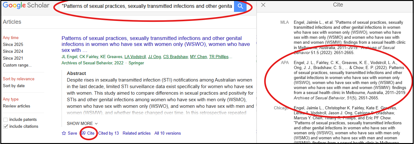 Por estas razones, se propone como alternativa utilizar el botón “citar” de Google Académico. Lo ideal sería ubicar el título del artículo para luego poder pegarlo en el buscador. En caso de que se “perdiera el rastro” de la fuente, la búsqueda se puede realizar a partir de los datos que figuran en la cita (Apellido, año), pero no va a ser tan efectiva. Si se observa el ejemplo propuesto en la Figura 30, lo que se hizo fue colocar una parte del título del artículo entre comillas y, una vez identificado el artículo correcto, dar clic en “citar” o “cite” (aunque en realidad se trata de una referencia y no de una cita). Como consecuencia, se abrió una ventana con la referencia del texto en los distintos sistemas de citado (Figura 30). Nunca se recomienda colocarla directamente en el listado sin una previa revisión, dado que este recurso también depende de cómo estén cargados los “metadatos” del artículo. Por ello, muchas veces se necesita realizar ajustes para que la referencia sea correcta. Sin embargo, de esta manera quien escribe no debe ingresar manualmente todos los campos, sino que sólo debe realizar las adecuaciones pertinentes cuando sea necesario. Para esto es importante conocer el formato y/o tener siempre a mano un manual para consultar.