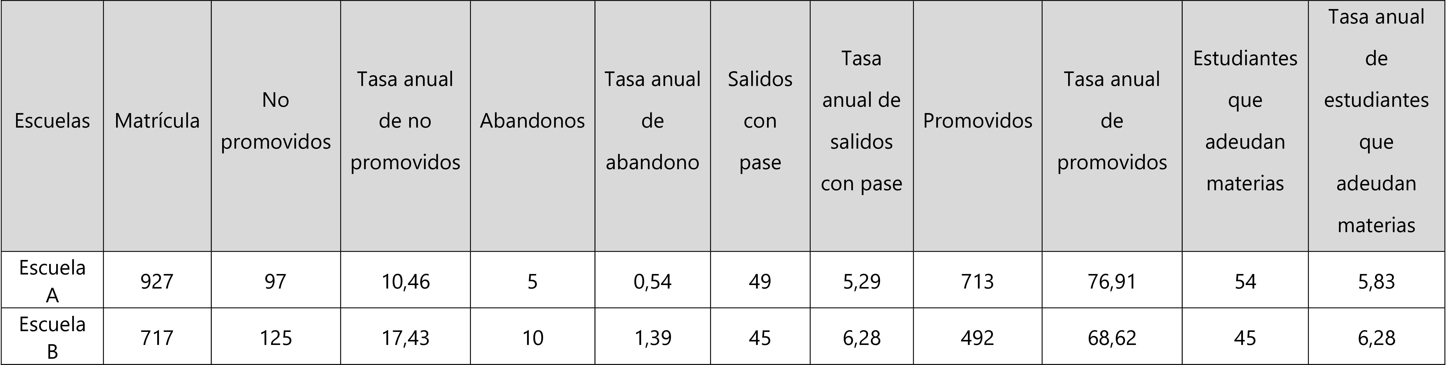 Con respecto a las tasas de promoción, podemos observar en la tabla 1 que los porcentajes de estas escuelas son del 76,91 % (escuela A) y del 68,62 % (escuela B). Al observar en la tabla 2 las tasas de promoción de la región vi donde estas instituciones se encuentran, vemos que son del 65,6 % (2017) y del 67,6 % (2018)[2]. Esto indica que las escuelas de la muestra presentan porcentajes más altos de esta variable respecto del total regional.