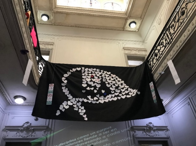 En las imágenes precedentes, es posible observar (imagen 1) intervenciones del centro de estudiantes en un momento electoral. Vale mencionar que la escuela cuenta con un activo centro de estudiantes. Observamos en la puerta de la biblioteca (imagen 2) una lámina con tapas de libros memorables de la literatura argentina, también realizada por estudiantes. En las dos imágenes que siguen (imágenes 3 y 4), el busto de Rivadavia intervenido ante la desaparición de Santiago Maldonado, hecho social que estuvo fuertemente convulsionando a la sociedad argentina en parte del periodo en que se llevó a cabo el trabajo de campo. Por último, el gran símbolo que representa a Abuelas y Madres de Plaza de Mayo (imagen 5) colgado en el hall de la escuela durante la semana del 24 de marzo. Cada imagen, cada intervención es una muestra no solo de la voz de los estudiantes, sino de la posición política que asumen como sujetos sociales dentro de la escuela. Una escuela que los reconoce y los escucha.