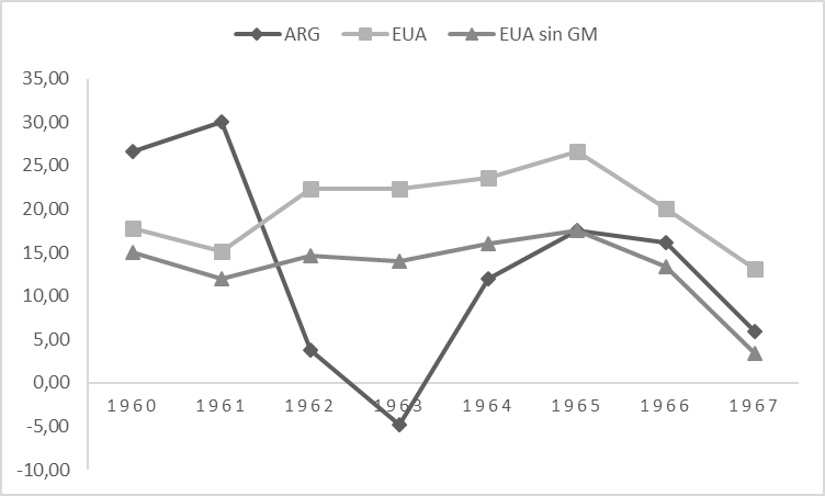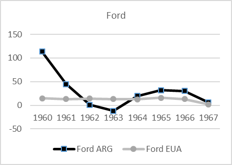 - Los márgenes sobre ventas de Chrysler, GM y Ford en Argentina en 1960 y 1961 fueron de 16,4% y 11,8%, respectivamente, mientras que los márgenes normales de General Motors a nivel mundial oscilaban entre el 6% y el 9%.↵