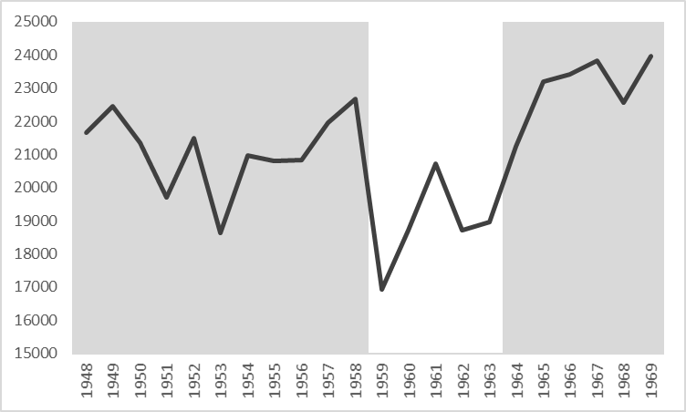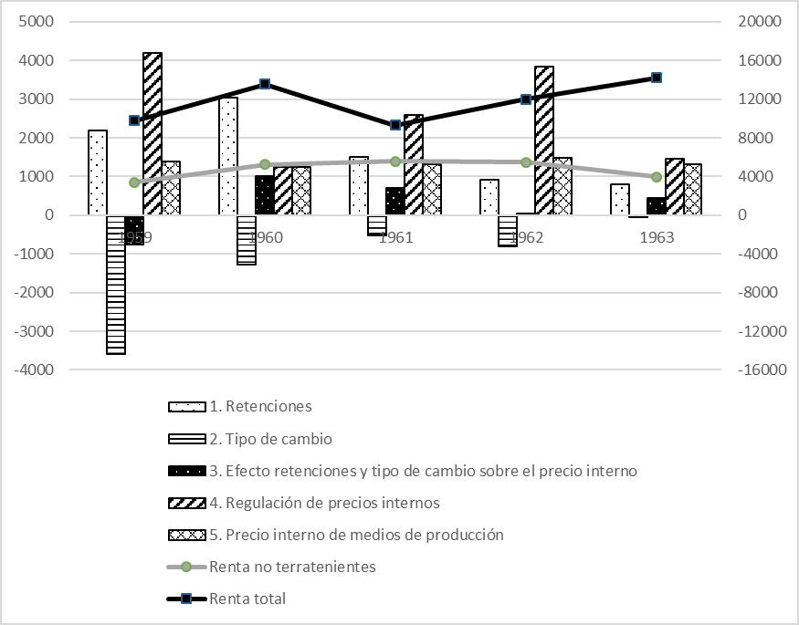 - En 1959, la subvaluación del peso resultante de la devaluación fue mayor que las rentenciones; es decir, éstas últimas no llegaron a compensar completamente la transferencia de riqueza social al sector agrario. A partir de 1960, la apreciación relativa de la moneda respecto del momento más bajo implicó que las retenciones pasen a ser forma de apropiación efectiva de renta agraria, más que compensando la subvaluación, ahora menor, del peso.↵